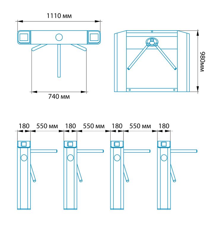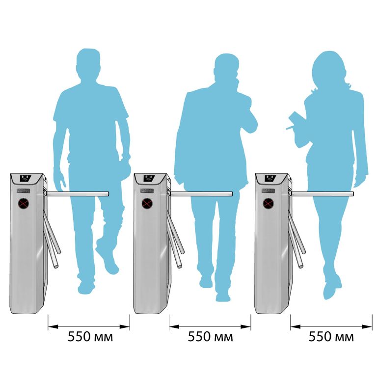 При обустройстве входной зоны, Тумбовые турникеты-триподы серии ТМБ рекомендуется располагать параллельно друг другу в одну линию. Расстояние между турникетами,в зависимости от размера пропускной штанги, может подвергаться модификации.