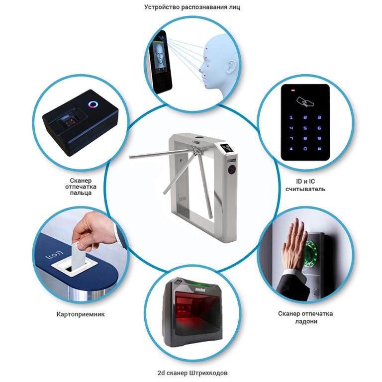 Турникет ТМБ 900 торговой марки БЛОКПОСТ можно оснастить устройствами идентификации пользователя: идентификатором лица, сканером отпечатка ладони/пальца, считывателем штрих-кода, картоприёмником. Контактный считыватель карт входит в базовую комплектацию турникета. Организация проходных с использованием устройств идентификации позволит наиболее быстро и точно определить возможность допуска человека через досмотровую зону без участия сотрудников охранной системы.