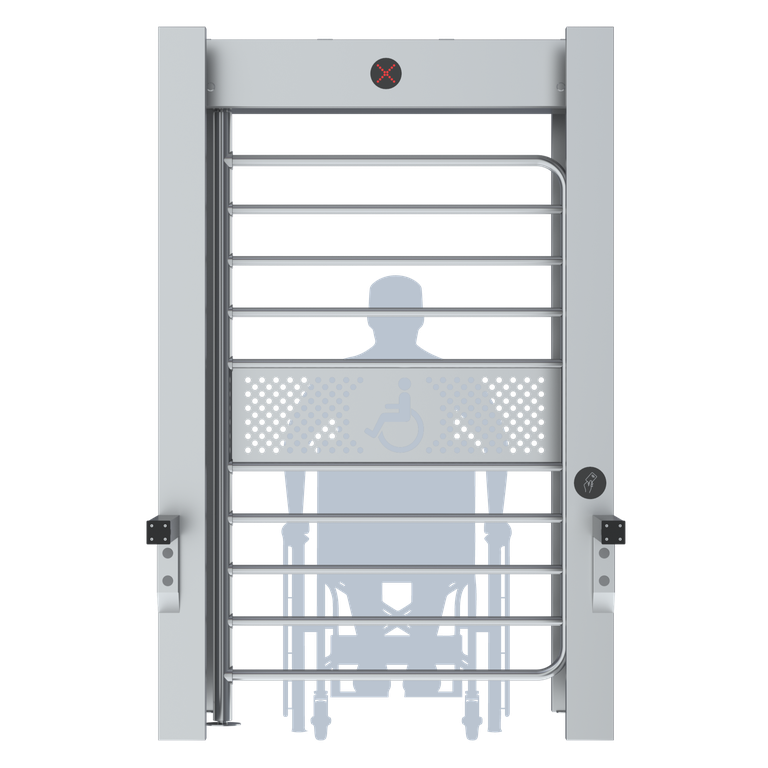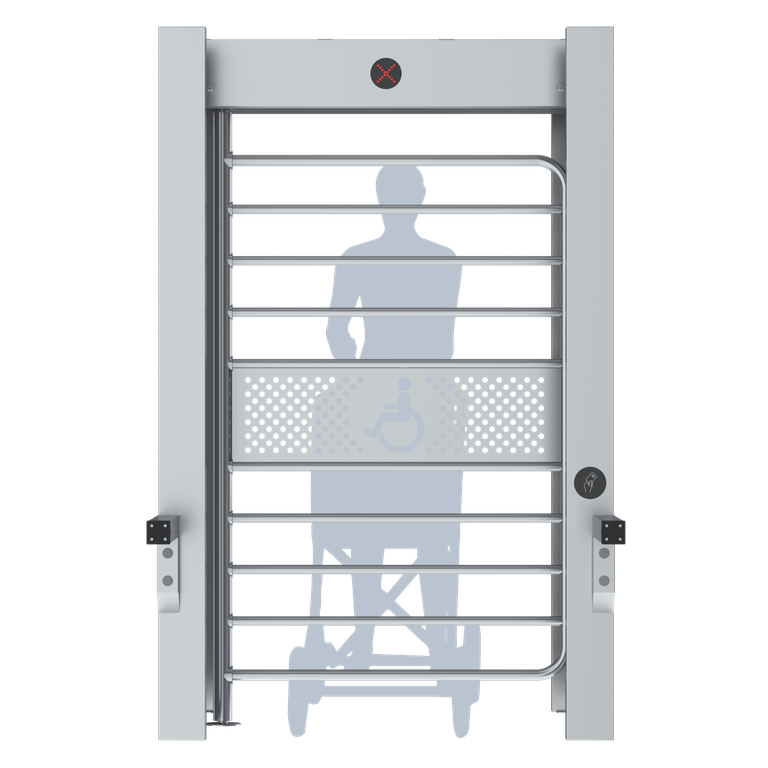 В организациях и на территориях с большим количеством посетителей-инвалидов, людей с колясками, а также на предприятиях, где необходимо обеспечить регулярный пронос крупногабаритных и длинномерных предметов, роторный турникет с полноростовой боковой калиткой шириной 1 метр — оптимальное решение. Также применяется в качестве эвакуационного выхода — в разблокированном состоянии распашная конструкция рассчитана на непрерывный поток, отсутствуют сдерживающие элементы.