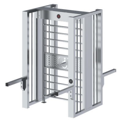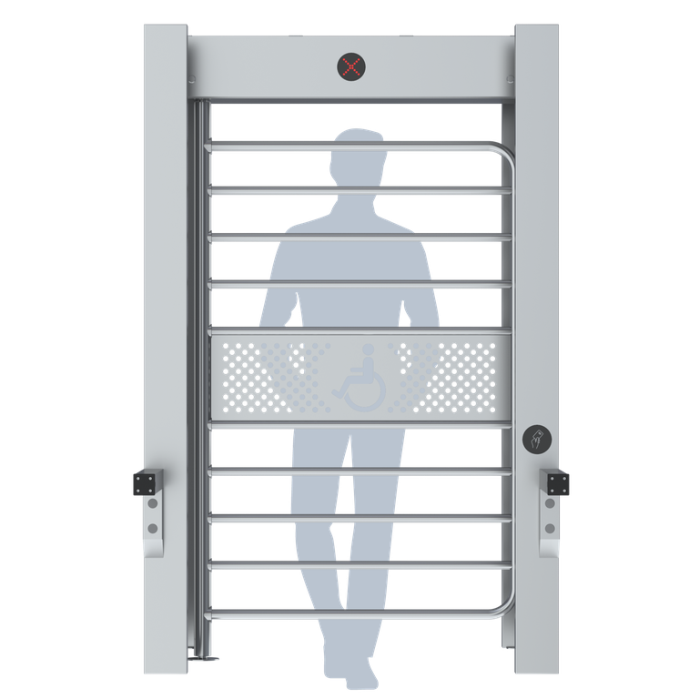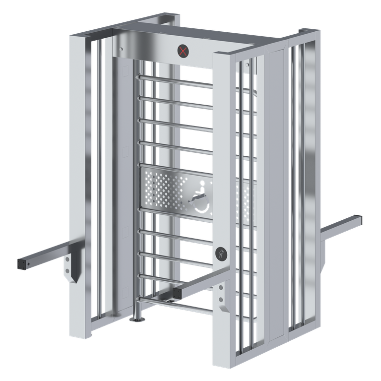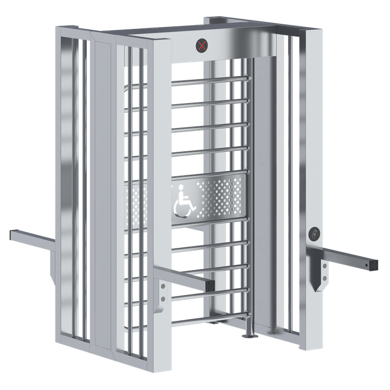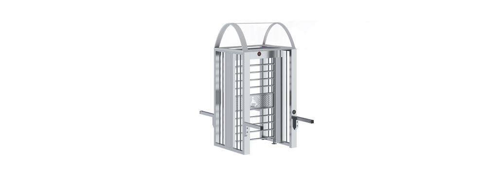 Полноростовый турникет с единой калиткой используется для контроля и ограничения доступа посетителей (в том числе с колясками, велосипедами, и людей с ограниченными возможностями) на объект. Обеспечивает поочередно вход и выход. Основная секция предусматривает только проезд инвалидов, людей с колясками и велосипедистов. Устанавливается как самостоятельным блоком, так и составе модульного заграждения из нескольких турникетов.