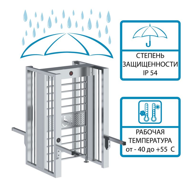 - Надежная безопасная конструкция — сварная рама из нержавеющей стали, защита от пыли/влаги IP 54. Установка в помещениях и на улице (требуется навес). Отсутствуют травмоопасные элементы для маломобильных групп населения. Световой сигнализатор направления прохода.