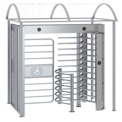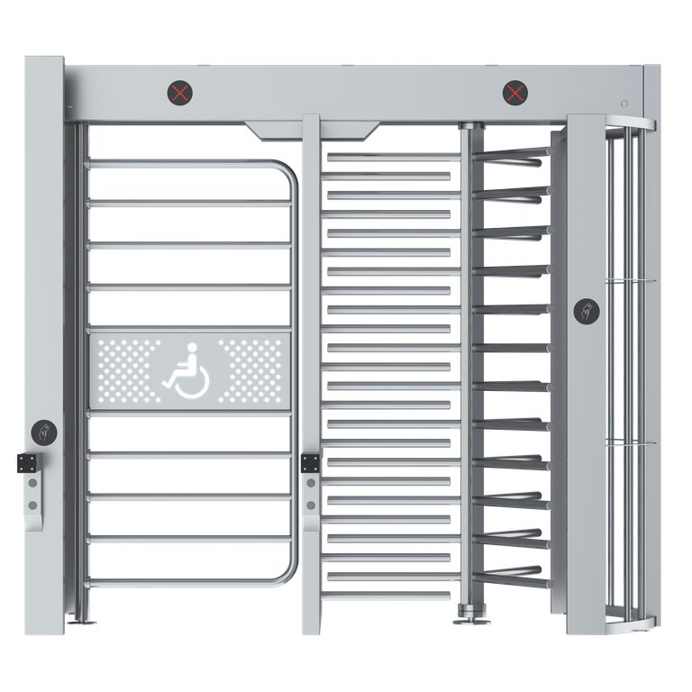 Полноростовый турникет с единой дополнительной калиткой и роторным блокиратором движения используется для контроля и ограничения доступа посетителей (в том числе с колясками, велосипедами, и людей с ограниченными возможностями) на объект. Обеспечивает поочередно вход и выход. Основная секция исключает преодоление лопастей (штанг) ротора. Устанавливается как самостоятельным блоком, так и составе модульного заграждения из нескольких турникетов.