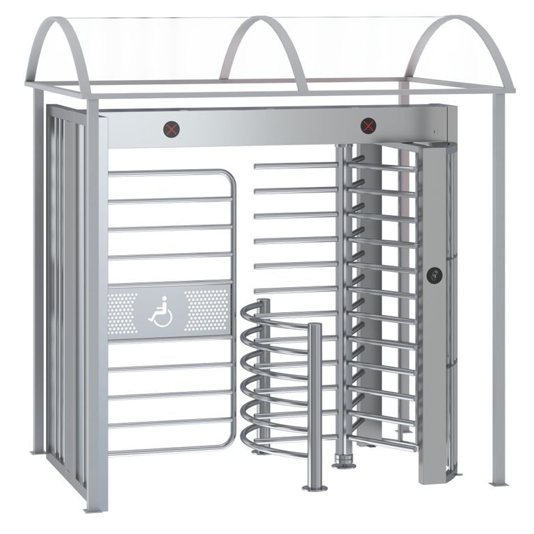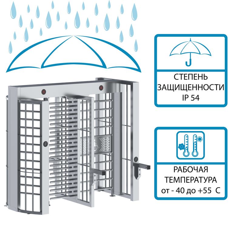 - Надежная безопасная конструкция — сварная рама из нержавеющей стали, защита от пыли/влаги IP 54. Установка в помещениях и на улице (требуется навес). Отсутствуют травмоопасные элементы для маломобильных групп населения. Световой сигнализатор направления прохода.
