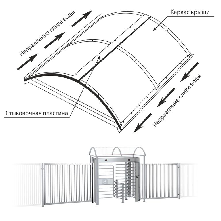 При использовании полноростового однопроходного турникета СПЕКТР на открытом воздухе необходимо использовать защитный навес. Такие меры предосторожности предохраняют турникет от прямого воздействия влаги и различных атмосферных осадков, обеспечивая долгосрочную стабильную работу устройства. Эксплуатация крыши допускается при температуре окружающего воздуха от -40°С до +55°С и влажности воздуха до 90%.