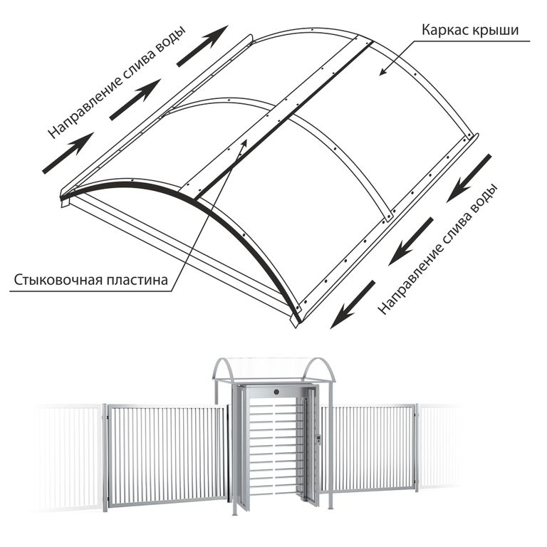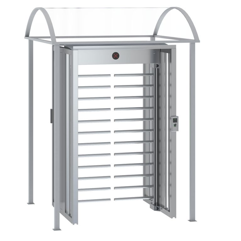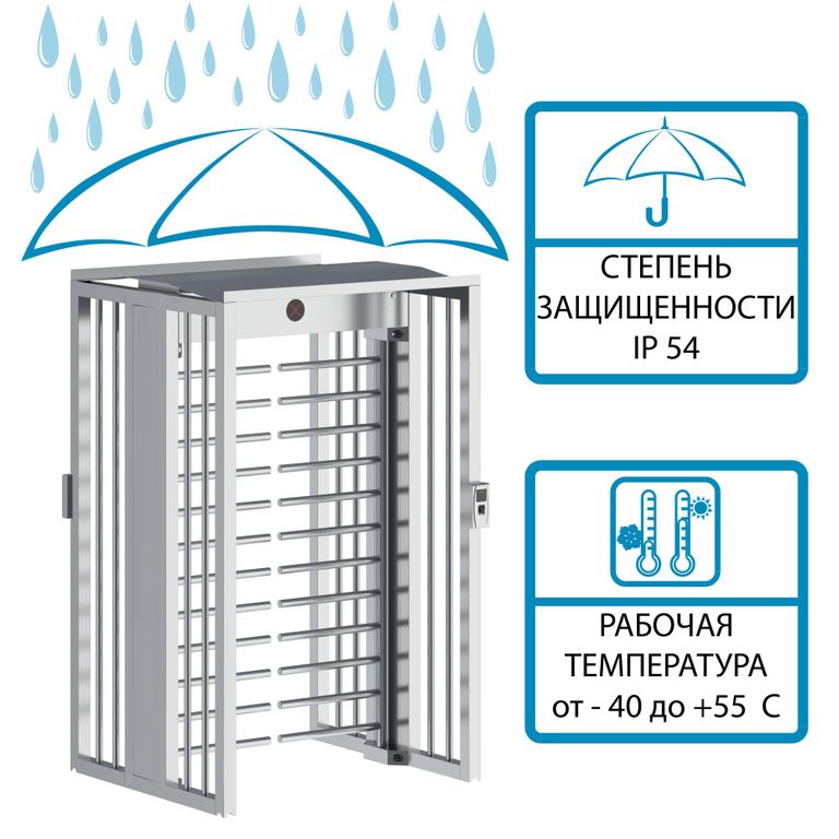 - Уличный и внутренний монтаж — турникет снабжен крышей с водостоком. Элементы терминала защищены от влаги и пыли по IP 54.