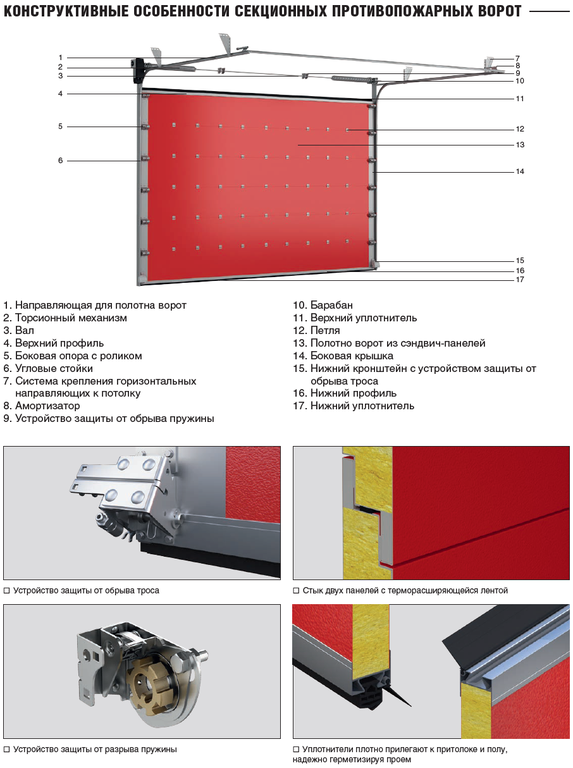 Противопожарные секционные ворота изготавливаются из огнестойких сэндвич-панелей с минераловатной прослойкой и имеют конструкцию классических секционных ворот. Из-за того, что ворота открываются вверх и откатываются под потолок, они занимают мало места внутри помещения и оставляют свободное пространство у проема. У противопожарных секционных ворот большой выбор типов подъема, что позволяет устанавливать их в помещения с разнообразными размерами притолоки. Противопожарные секционные ворота безопасны в использовании т.к. в их конструкции имеются защитные устройства от разрыва троса и обрыва торсионной пружины, что обеспечивает надежную работу и предотвращает падение полотна ворот. Противопожарные секционные ворота имеют более легкий вес по сравнению с аналогами, предлагаемыми на современном рынке.