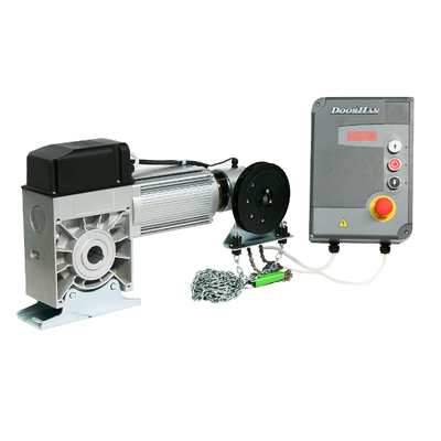 Привод для рольворот Shaft-500 может быть установлен в помещениях промышленного, коммерческого, бытового и любого другого объекта. Привод прост в управлении и безопасен при эксплуатации: в случае нештатной ситуации нажатие на аварийную кнопку приводит к незамедлительному выключению питания блока управления электродвигателя. Быстрая и точная остановка электродвигателя обеспечивается электромагнитной системой торможения. Для повышения надежности работы привода в конструкции использованы двойные концевые выключатели. При отключении электропитания управление воротами осуществляется вручную при помощи цепного редуктора.